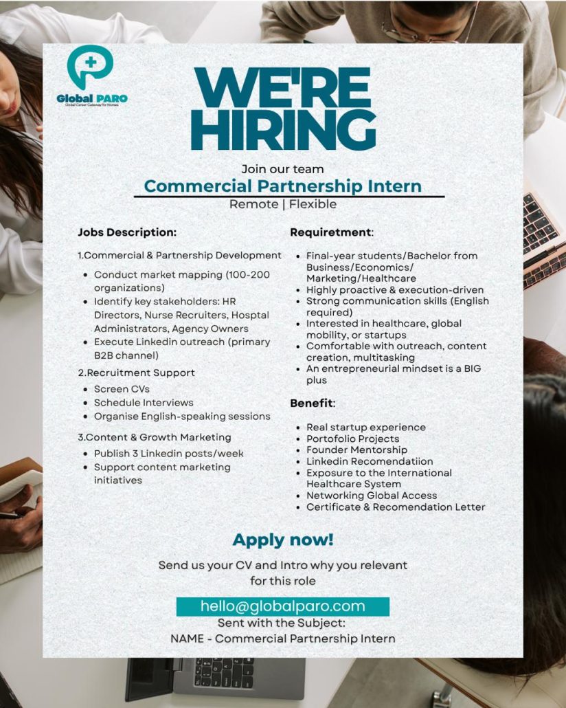 Segera kirimkan CV dan lamaran ke hello@globalparo.com dengan subjek NAMA_Commercial Partnership Intern.
